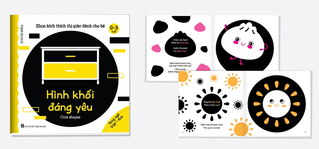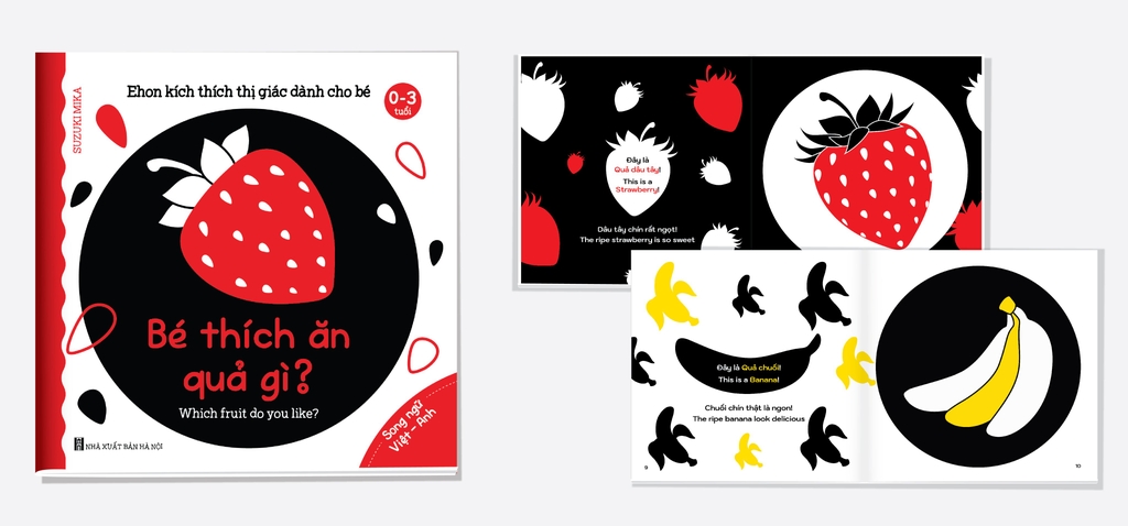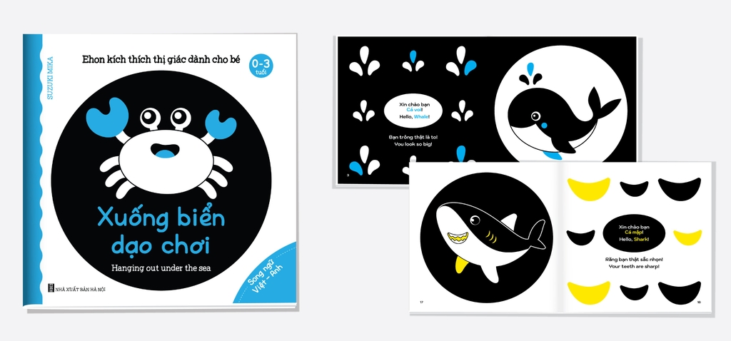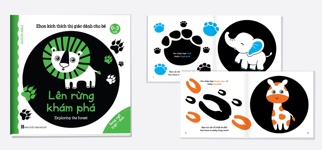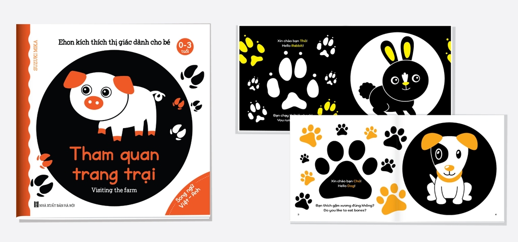 Bộ Ehon kích thích thị giác với 2 tông màu đen – trắng chủ đạo, kết hợp cùng với những sắc màu rực rỡ khác sẽ kích thích phát triển thị giác cho bé, đồng thời giúp bé phát triển nhận thức về thế giới xung quanh, mở rộng vốn từ tiếng Việt, nâng cao khả năng ghi nhớ vốn từ tiếng Anh.