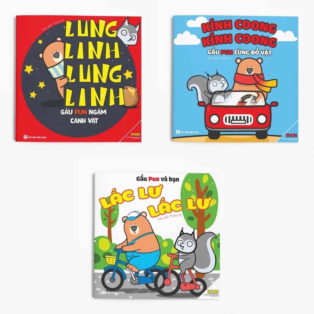 Bộ Ehon này được đặt tên với những âm thanh/màu sắc dễ thương như “Kính Coong Kính Coong”, “Lắc lư Lắc lư” hay “Lung linh Lung linh” với những hình ảnh sinh động tạo cảm giác nhẹ nhàng nhưng thật gần gũi. Ngoài việc biết được các loài động vật, âm thanh độc đáo nhưng gần gũi trong cuộc sống, sách Ehon Gấu Pun còn đem các con khám phá một thế giới vui nhộn, đầy tiếng cười với những bài học nhẹ nhàng bố mẹ ạ.